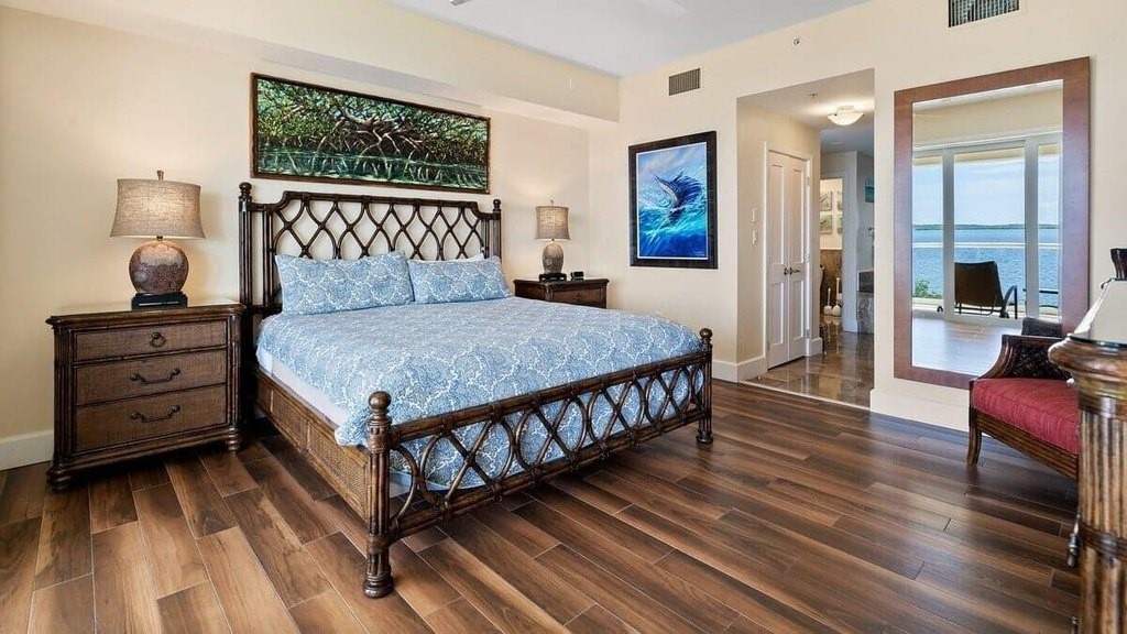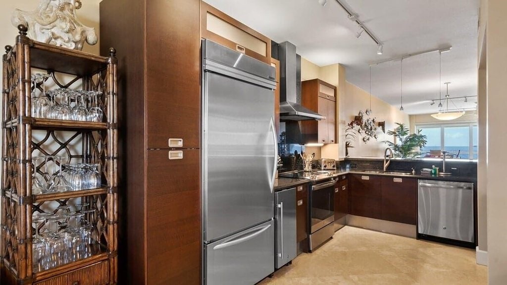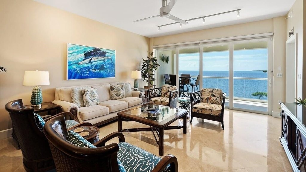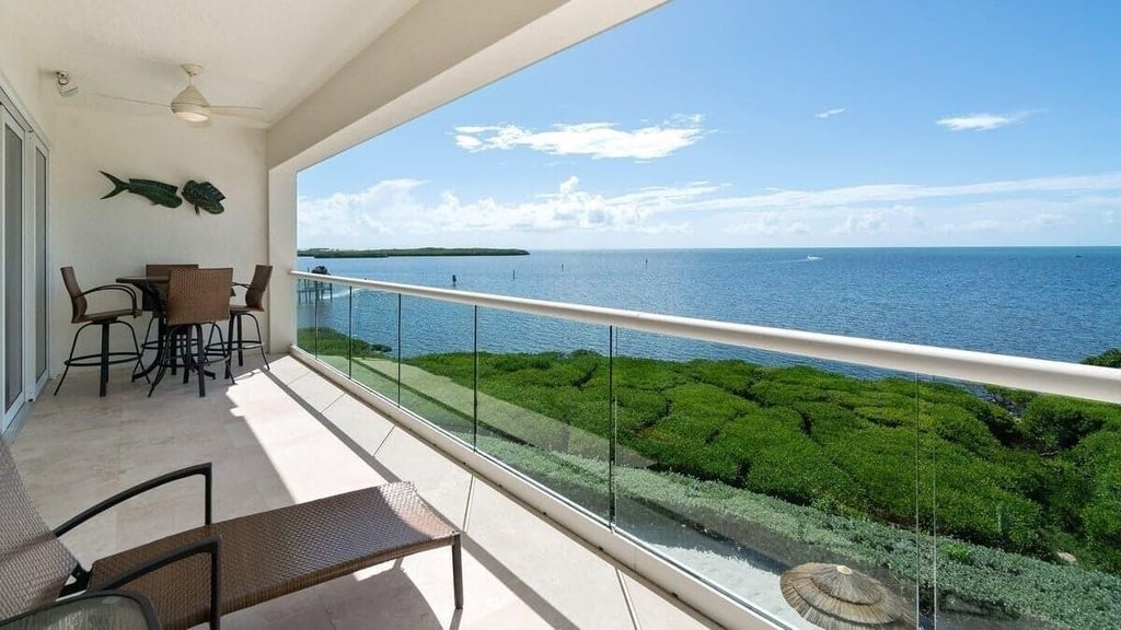 Oceanfront Top Floor Luxury Condo in desirable Mariner's Club Resort and Marina with breathtaking open ocean views from your very first step inside. Soak in the ocean breeze on the open-air veranda or spend the day enjoying a full slate of resort-style amenities. This spacious private villa is offered move-in ready with hand-picked island-style furniture perfect for your personal use and/or to continue with the current professional rental managers for an income-producing investment with short-term, nightly rentals allowed. This 2-bedroom, 2.5 bath condo has been enjoyed as a relaxing second home and has also been a popular rental for the past 10 years with repeat guests returning year after year. The home itself is a spacious split plan with high ceilings, premium finishes, gleaming marble floors, impact windows and doors, stainless appliances and a new A/C system. The ocean view primary suite includes generous his-and-hers walk-in closets, and an elegant ensuite bath with spa tub, glassed shower and dual vanities. The private second bedroom also offers a king bed, large closet, and ensuite bath, and there are large flat screen TVs in both bedrooms and the living room. The nearly 2, 000 square foot unit is all on one level (no interior stairs) and offers enough space to be easily converted to a 3-bedroom if desired. Mariner's Club is a prestigious resort-style community with two large swimming pools, waterfront clubhouse with intriguing lounge and event spaces, spa, waterfall grotto, fitness center, a staffed 43-slip marina with dry rack storage, basketball and tennis courts, and one-of-a-kind indoor pickleball courts for playing in any weather! The tropically landscaped grounds include a sandy beach, tiki huts, a fishing pier, EV charging stations, lush orchid gardens, a manned guard gate and 24-hour security. In addition to the long list of amenities, Mariner's Club is also desirable to investors because it allows nightly rentals, which is very rare in the Keys!
